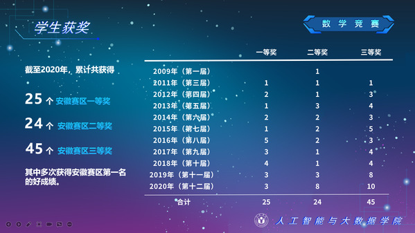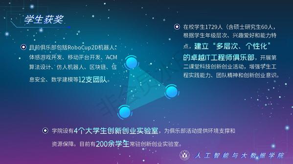 人工智能與大數據學院緊緊圍繞學校人才培養中心工作,2012年以來積極開展以學生科技創新創業為主的第二課堂工作,以學生“能力水平、專業類別和興趣愛好”為根本出發點,目前成立了: RoboCup機器人足球、數學建模、AR/VR團隊、物聯網創新設計、移動應用開發、ACM-ICPC算法設計、仿人機器人、水下機器人、區塊鏈、網絡與信息安全等16支團隊,并且專門建設了機器視覺應用、數學建模與仿真等6個學生創新實驗室、移動APP開發、多智能體系統、數據分析與仿真等8個大學生創客中心;為各團隊提供良好的環境和資源。通過這些工作的開展,人工智能與大數據學院大學生的創新創業能力逐步增強,目前有200余人常駐創新創業實驗室。近五年在師生共同努力下,在各類競賽中共獲獎800項,其中國際級21項,國家級獎項160余項、省級獎項600余項。RoboCup機器人2D仿真足球隊連續5次進入世界杯前8強,先后獲得葡萄牙公開賽冠軍、世界杯季軍等國際獎項,是世界杯、中國機器人足球賽公認強隊;此外獲得中國機器人大賽暨RoboCup公開賽曾獲得國家特等獎1項、美國大學生數學建模競賽獲得國際二等獎6項,全國大學生數學建模競賽獲得國家二等獎1項,CCPC中國大學生程序設計競賽總決賽銀牌,Robocup機器人世界杯中國賽獲得亞軍,“哈工大杯”第十六屆全國機器人錦標賽暨“博思威龍杯”第五屆國際仿人機器人奧林匹克大賽獲得國家一等獎2項,“藍橋杯”全國軟件和信息技術專業人才大賽個人賽曾獲得國家一等獎2項,“田家炳杯”第六屆全國師范院校師范生教學技能競賽國家二等獎、第二屆全國師范生微課設計大賽國家特等獎等。獲批大學生創新創業訓練計劃項目國家級86項,省級168項,獲批大學生創客實驗室項目8項,2名優秀學生獲得安徽省“創新之星”榮譽稱號。
