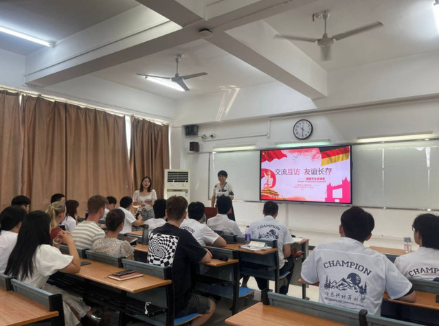 9月5日下午,一場別開生面的“交流互訪友誼長存”-德國學生進課堂主題團日活動在36棟202教室隆重舉行。此次團日活動由2023級信息與計算科學專業學生周思雨主持,人工智能與大數據學院黨委書記牛欣、院團委書記章云冉、專業負責人邵桂偉、專業班主任蔣雨燕、德語老師朱俊俏出席,全體23級信息與計算科學(中外)專業學生參加,四名德國交流生應邀參加。
