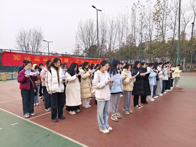 12月13日清晨,參加活動的學生以飽滿的精神狀態在一期校園體育場集合。活動伊始,全體學生排好隊形,整齊肅立。隨后,在領讀同學的帶領下,一起朗讀《憲法》的節選內容。天氣雖然寒冷,但我院學子神情專注而又莊重,朗讀聲清晰而又堅定。在每一聲鏗鏘有力的聲音中,學生們用昂揚向上的熱情驅散了寒意,用奮進拼搏的姿態推動了憲法晨讀活動走向高潮。