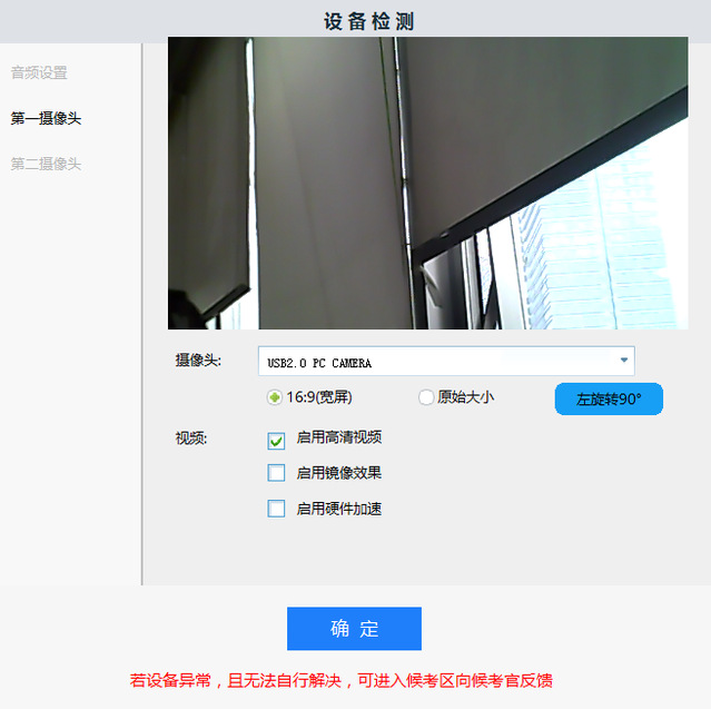 進入候考場之前,考生需要先進行設備檢測,包括音頻檢測、第一攝像頭檢測和第二攝像頭檢測