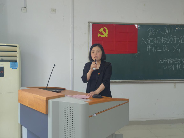 開班典禮在莊嚴的國歌聲中開始。首先由第八期入黨積極分子學生代表、22級經濟工程1班龔小清同學發言。她分享了自己對黨的二十大報告的理解認識并承諾在黨課學習中嚴于律己,共同努力。隨后,學生黨支部書記程越岳老師作為教師代表發言,他要求培訓班學員應當深刻學習理解二十大精神內涵,同時,作為入黨積極分子,應嚴格遵守相關規定,認真理解感悟,從而在黨課中學有所獲,學有所成。最后,由經濟與管理學院黨委副書記夏丹青老師作動員講話,她希望同學們珍惜本期黨課學習機會,同時提出只有堅定理想信念,端正入黨動機,才能抵擋前方路途的荊棘,堅定不移地朝著目標前進。