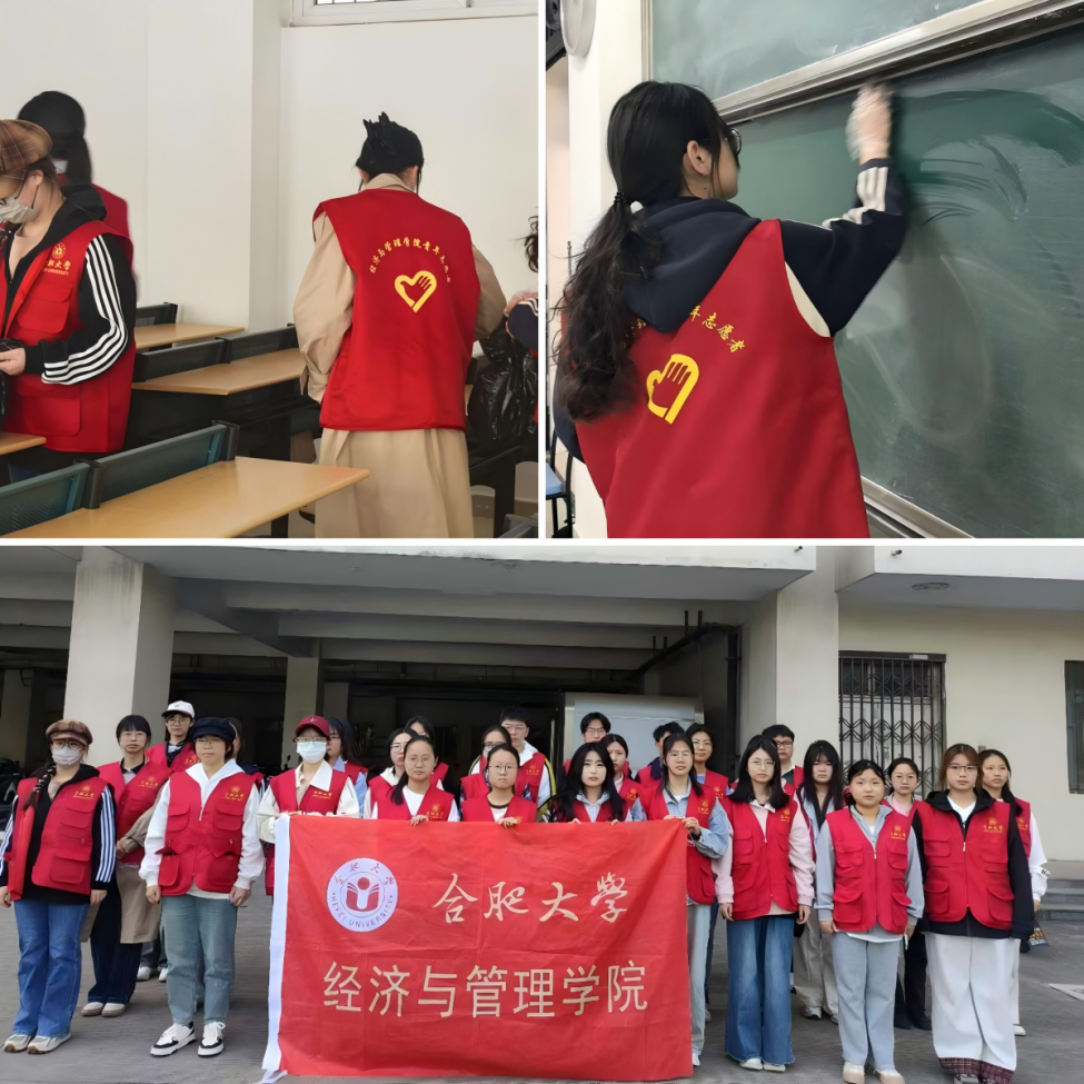 陽春布德澤,萬物生光輝。在這春意盎然的美好時節,為厚植學生公共衛生意識,繪就校園文明新畫卷,合肥大學經濟與管理學院于4月13日上午精心策劃并開展了“志愿服務在行動,文明校園靠大家”主題清潔活動。24名學生志愿者以實際行動詮釋奉獻精神,用勞動的汗水譜寫文明樂章。 活動伊始,全體志愿者身著統一紅色馬甲,手持學院旗幟在教學樓前合影留念。朝氣蓬勃的學子們分作四支小隊,每隊各由一名學生骨干負責統籌協調。隊員們分工協作,各司其職。他們彎腰整理桌椅,將殘留的垃圾裝袋;又細致擦拭桌面,讓木紋重現光澤;更不畏臟累清理墻角縫隙,將長期積攢的雜物盡數清除。