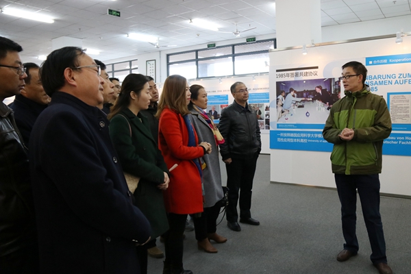 2日上午,與會(huì)代表來訪我校,并參觀了我校中德合作共建三十周年圖片展。我校黨委委員、宣傳部部長劉樟樹熱情接待了來賓,研究生處伍德勤處長介紹了我校專業(yè)碩士培養(yǎng)情況。在參觀中德合作圖片展過程中,劉樟樹詳細(xì)講解了我校與德國應(yīng)用科學(xué)大學(xué)合作發(fā)展的歷史、成果以及我?!暗胤叫浴?yīng)用型、國際化”的辦學(xué)定位,并介紹了德國總理默克爾與國務(wù)院總理李克強(qiáng)共同視察我校的情況。與會(huì)代表對(duì)我??焖侔l(fā)展的歷史和中德合作的累累碩果表示了由衷的贊嘆,對(duì)我校專業(yè)碩士培養(yǎng)的特色給予了充分的肯定。之后,代表們前往廬江縣考察安徽農(nóng)業(yè)大學(xué)皖中農(nóng)業(yè)綜合實(shí)踐基地。