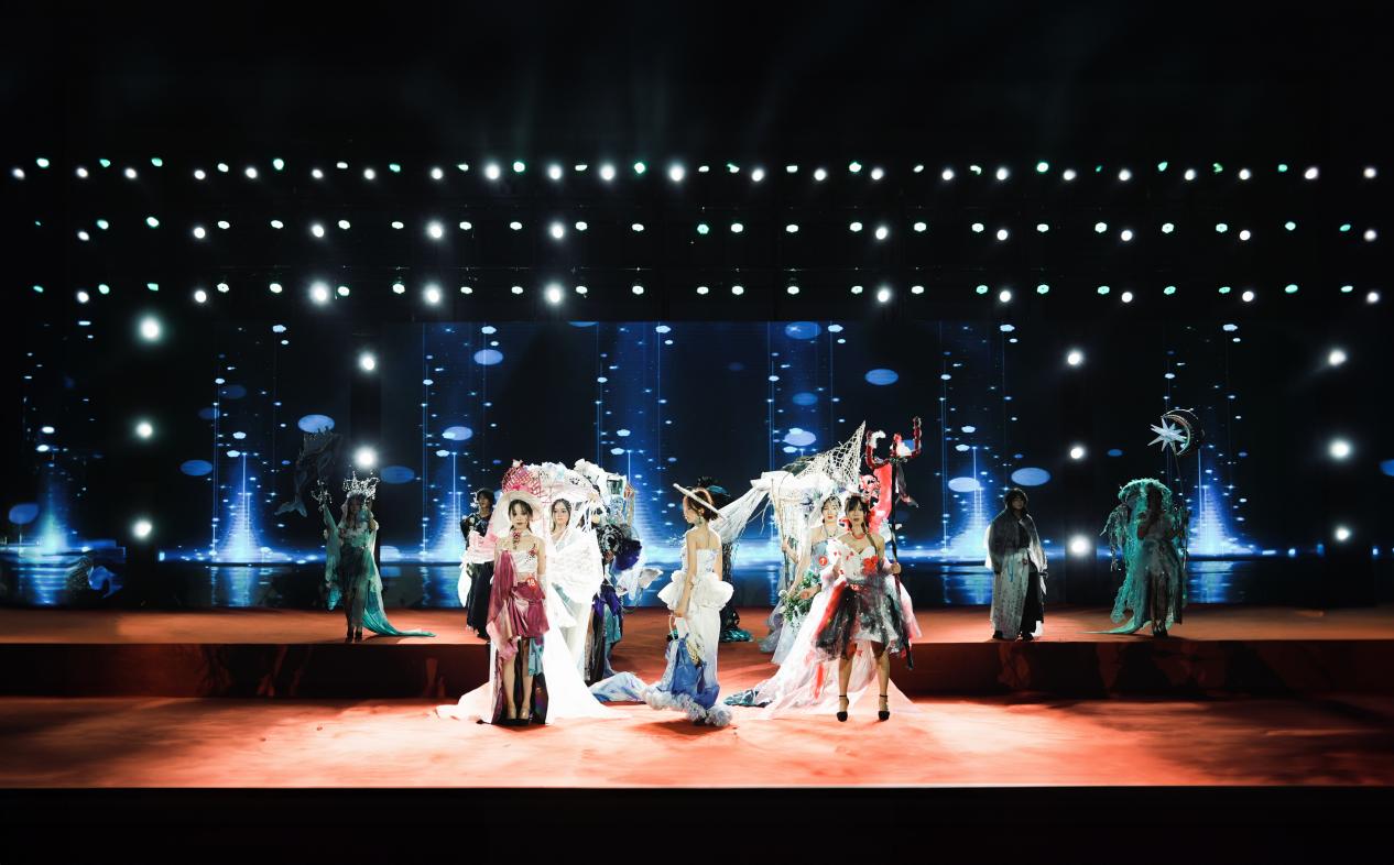在比賽中,設計學院模特隊20位模特身穿我院設計師設計的服裝閃亮登場。我院系列作品充分考慮了環(huán)保和可持續(xù)發(fā)展的原則,巧妙運用空易拉罐、礦泉水瓶、舊作業(yè)本、舊布料、廢棄塑料袋、樹枝樹葉等環(huán)保材料,將海洋與環(huán)保主題有機結(jié)合,不僅展現(xiàn)了精美的服裝,更體現(xiàn)了對資源節(jié)約和環(huán)境友好的追求。